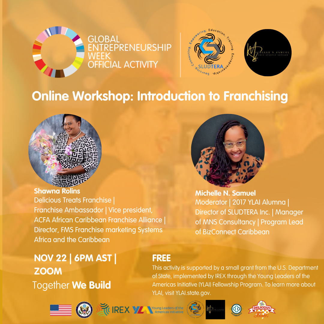 The Franchising Education & Development Series, is a strategic initiative presented by Michelle N. Samuel in collaboration with the U.S. Department of State, IREX, and the YLAI Alumni Network. The initiative will be implemented in partnership with Michelle's businesses MNS Consultancy and SLUDTERA Inc. Michelle is a 2017 YLAI Alumna and business development & social impact strategist. The program is designed to introduce, educate, and empower Caribbean entrepreneurs to grow and scale their businesses through franchising. This initiative will be executed in two progressive phases: